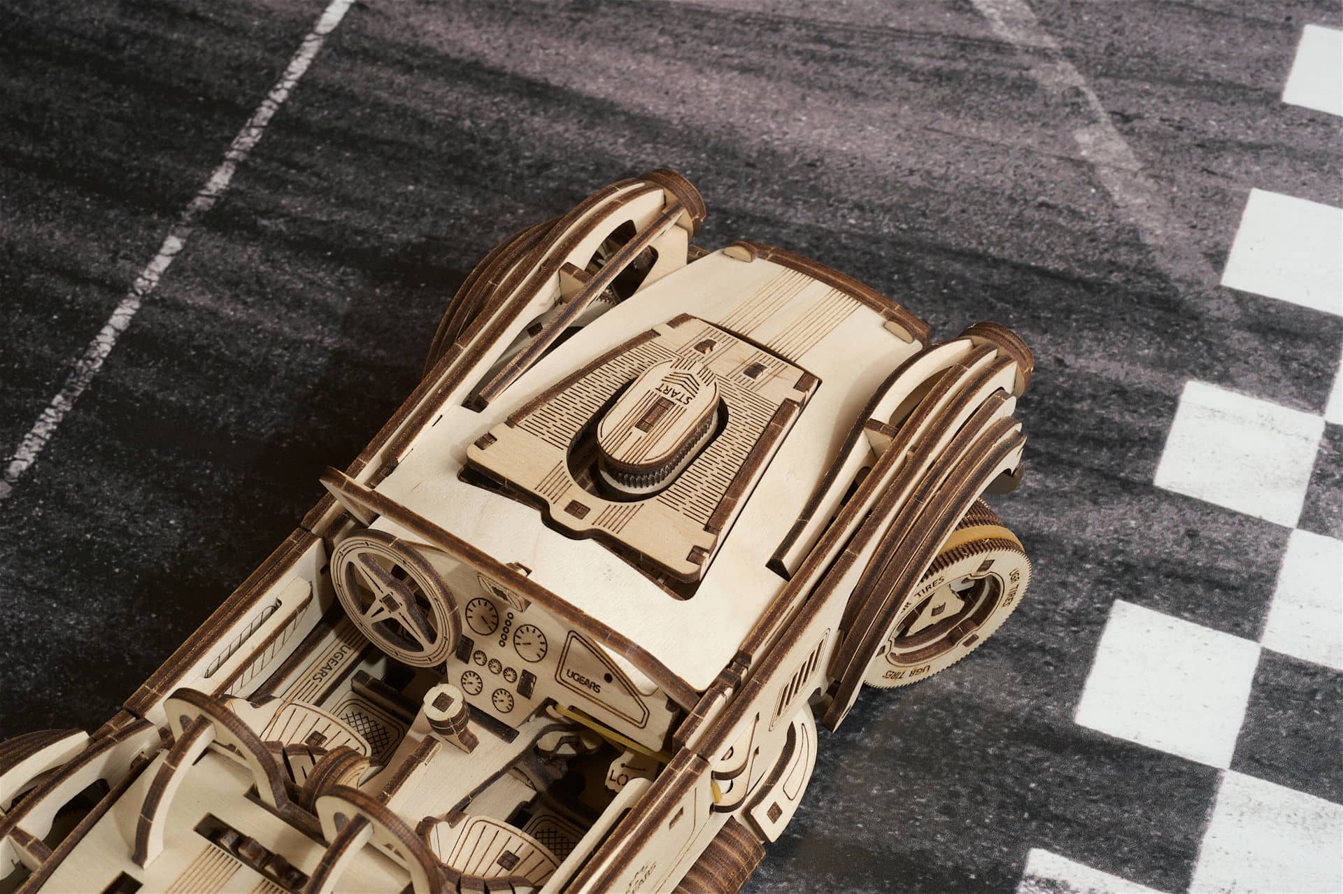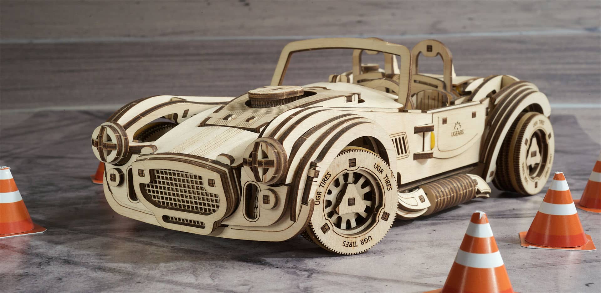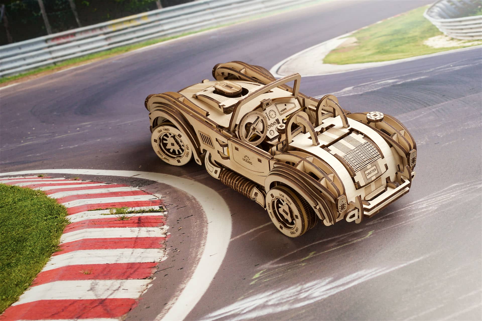 Napędzany potężnym silnikiem sprężynowym, samochód wyścigowy Ugears Drift Cobra ma najszybszy zespół koni pod maską spośród wszystkich mechanicznych modeli drewnianych, jakie znamy. Model jest nakręcany za pomocą pokrętła z zapadką znajdującego się pod podwoziem. Przed nakręceniem swojego trójwymiarowego drewnianego modelu samochodu wyścigowego Drift Cobra przesuń filtr powietrza, który wystaje z maski w kierunku przedniej szyby. A przełącznik znajdujący się przed siedzeniem po stronie pasażera ustaw w pozycji Lock (równolegle do drzwi). Teraz przekręć zapadkę pod nadwoziem samochodu. Po 6 do 6,5 obrotach sprężyna jest w pełni nakręcona i – vroom! vroom! – Twoja wyścigówka jest gotowa do ryku! Ustaw dźwignię zmiany biegów, znajdującą się pomiędzy siedzeniami kierowcy i pasażera, w żądanej pozycji (Reverse, Neutral, Drive). Aby uruchomić model, połóż go na płaskiej powierzchni, przesuń filtr powietrza do przodu i obserwuj, jak Twoja Cobra pali gumę na torze (zacznij z kołami obróconymi w jedną stronę), robi kółka lub przyspiesza w linii prostej.