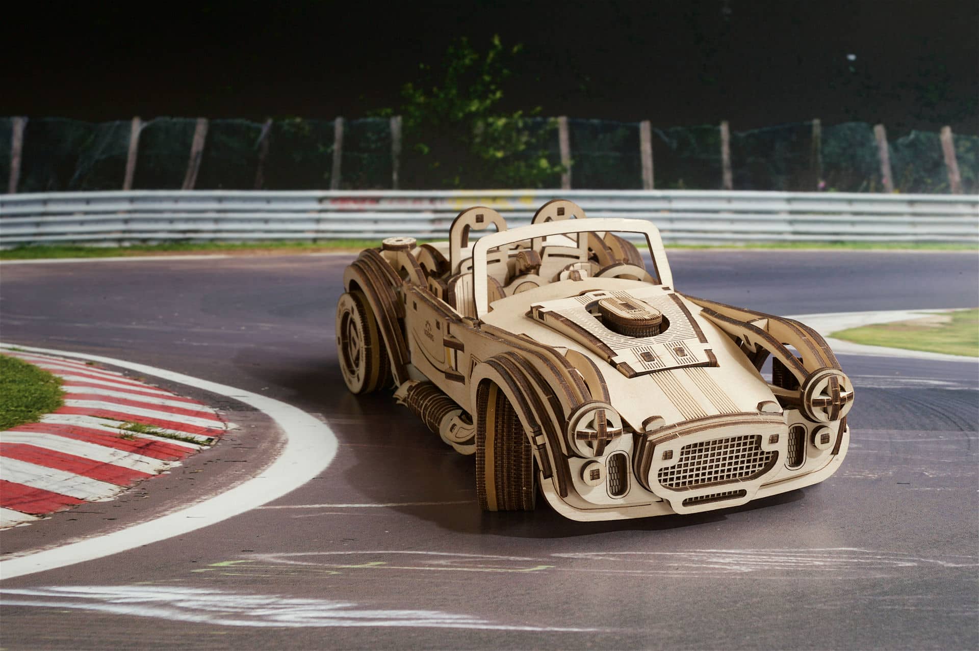 Uważamy, że ten model 3D do składania puzzli / majsterkowania jest piękny, z grubymi oponami, wybujałymi krzywiznami (dzięki kawałkom precyzyjnie wyciętym laserowo z cienkiej sklejki o grubości 1 mm), wielką otwartą paszczą z przodu i otwartym dachem kabrioletu. Ruchome części tego drewnianego samochodu to obracające się przednie koła, otwierane drzwi oraz podnoszona maska i bagażnik. Zamiast gumowego silnika zastosowaliśmy mocny mechanizm sprężynowy, który dodaje modelowi „siły” i wydłuża jego żywotność. Mechanizm zapadkowy sprawia, że nie musisz trzymać gałki przez cały czas nawijania modelu. Energia potencjalna jest magazynowana z każdym obrotem, bez poślizgu, aż do momentu, gdy silna wewnętrzna sprężyna zostanie w pełni nakręcona.