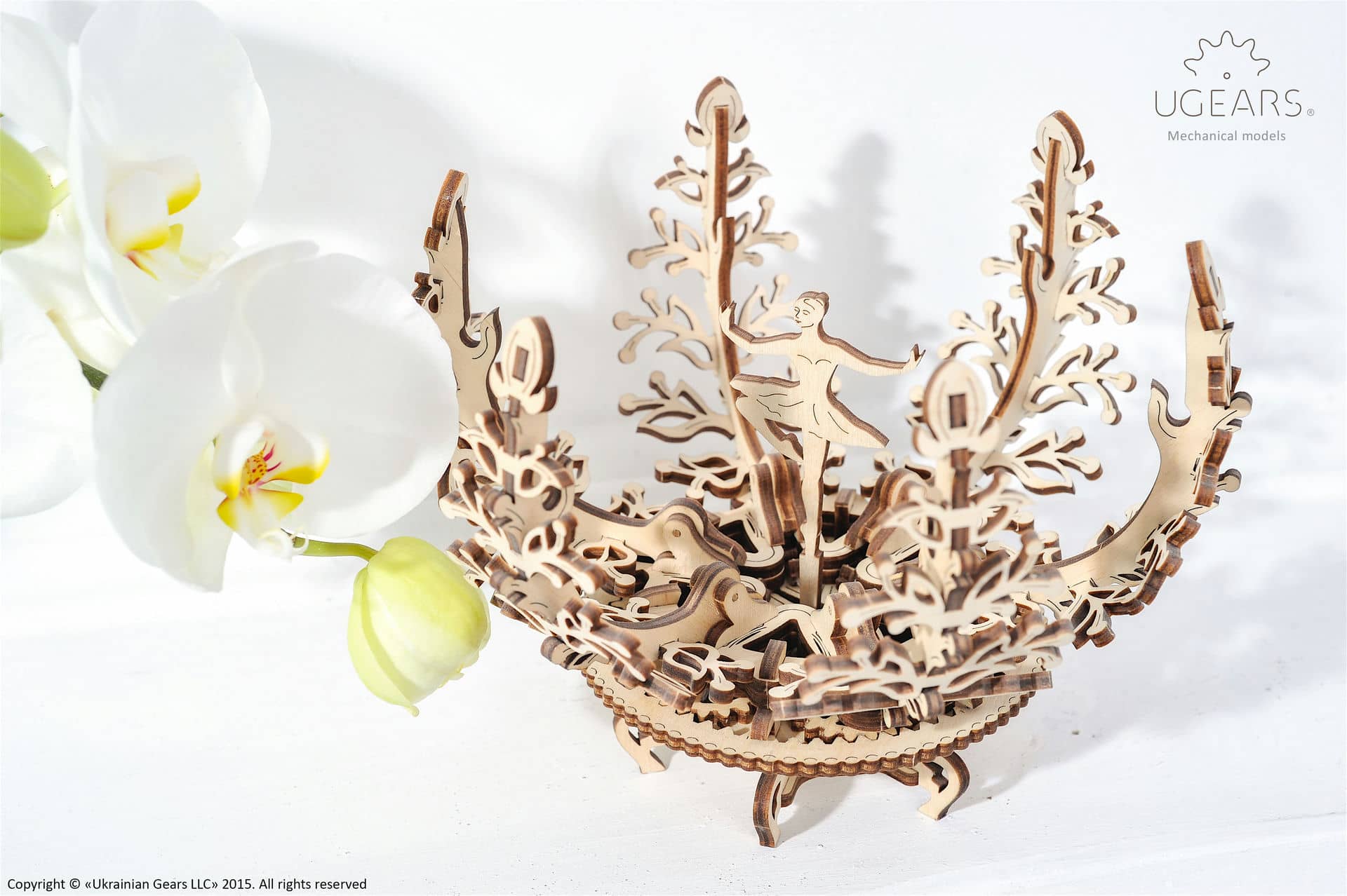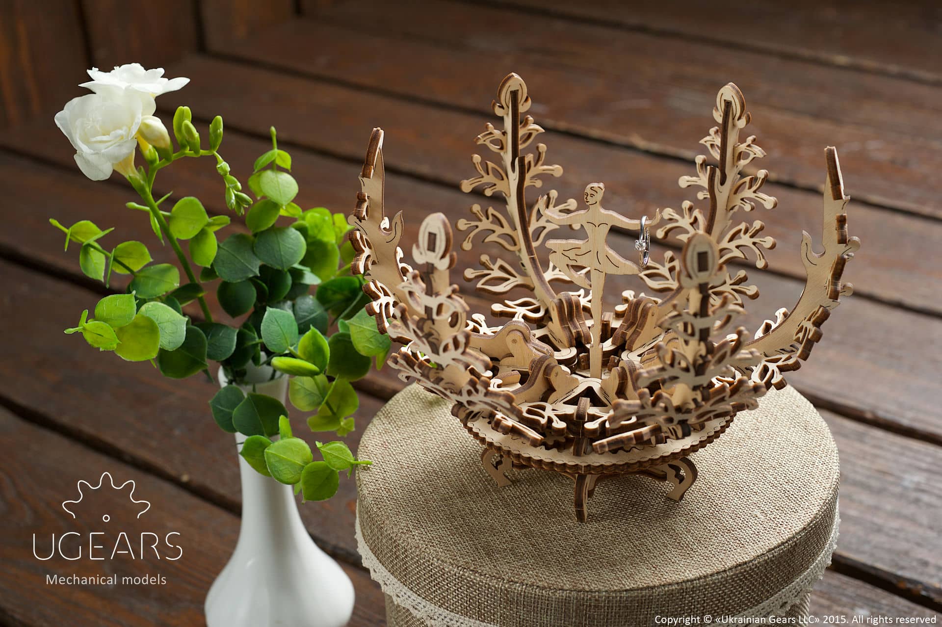 W Mechanicznej Szkatułce – Kwiatie możesz przechowywać i prezentować słodycze oraz małe przedmioty i biżuterię. Zestaw zawiera dwie podstawki o różnym kształcie: jeden w postaci baleriny, drugi w kształcie drzewka szczęścia