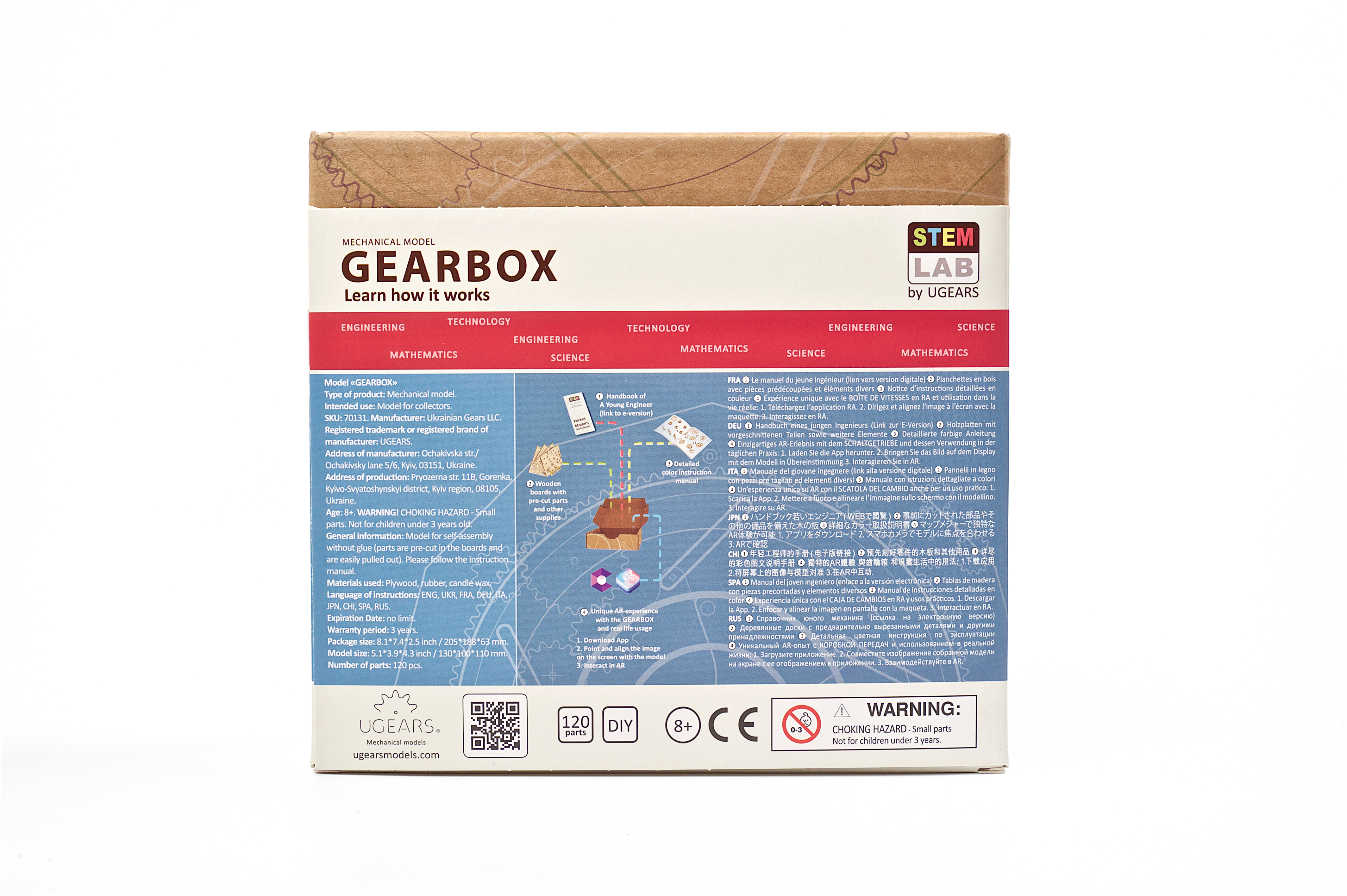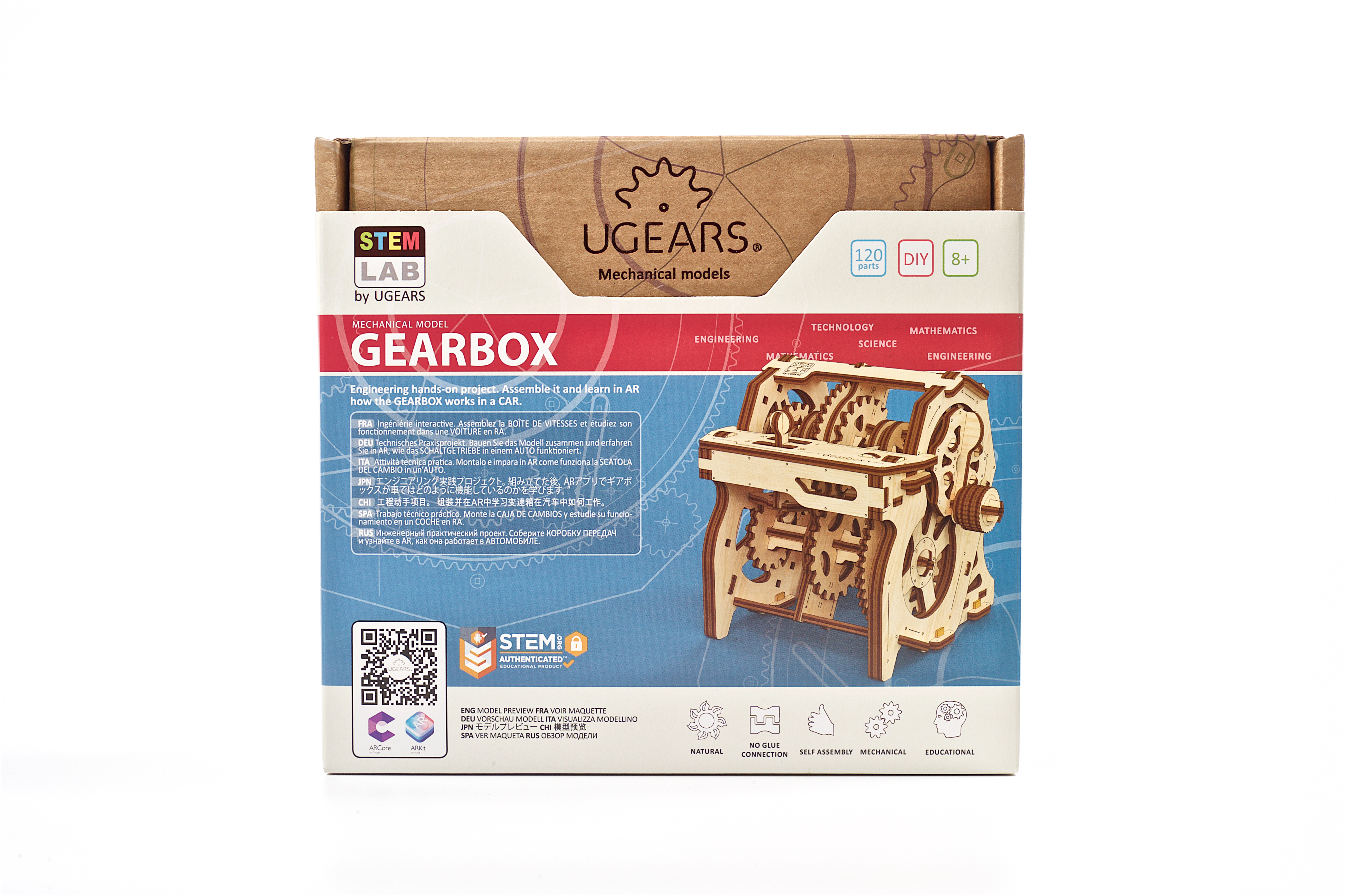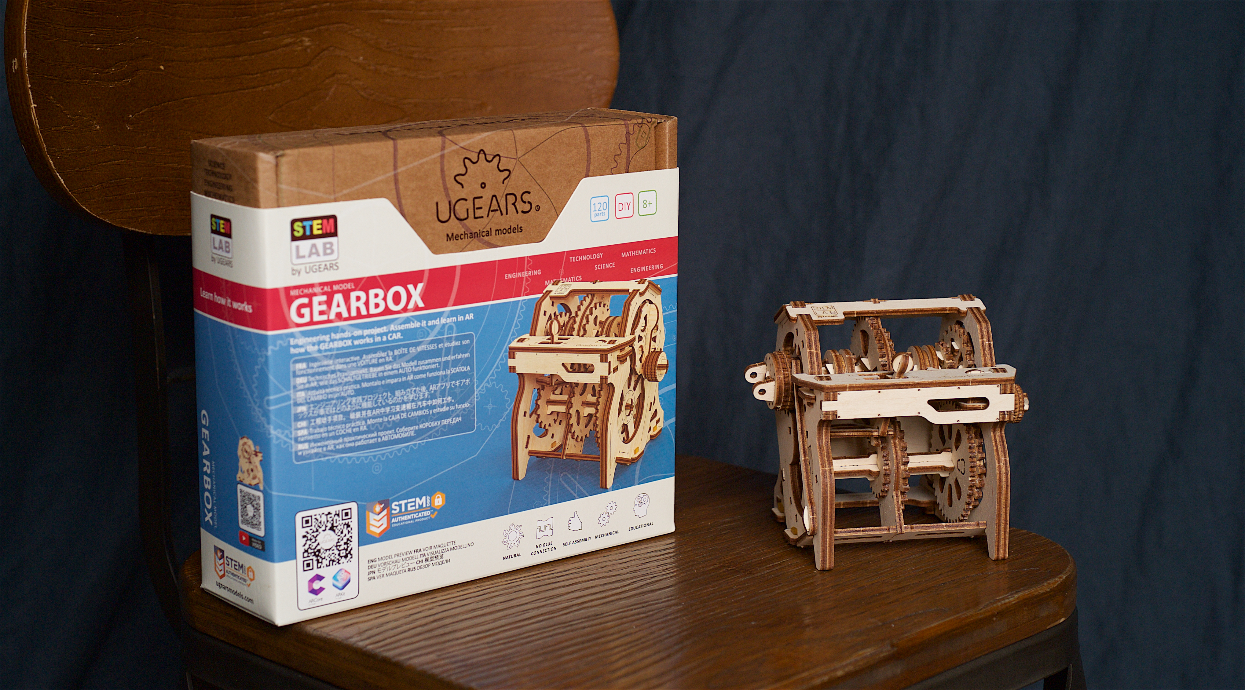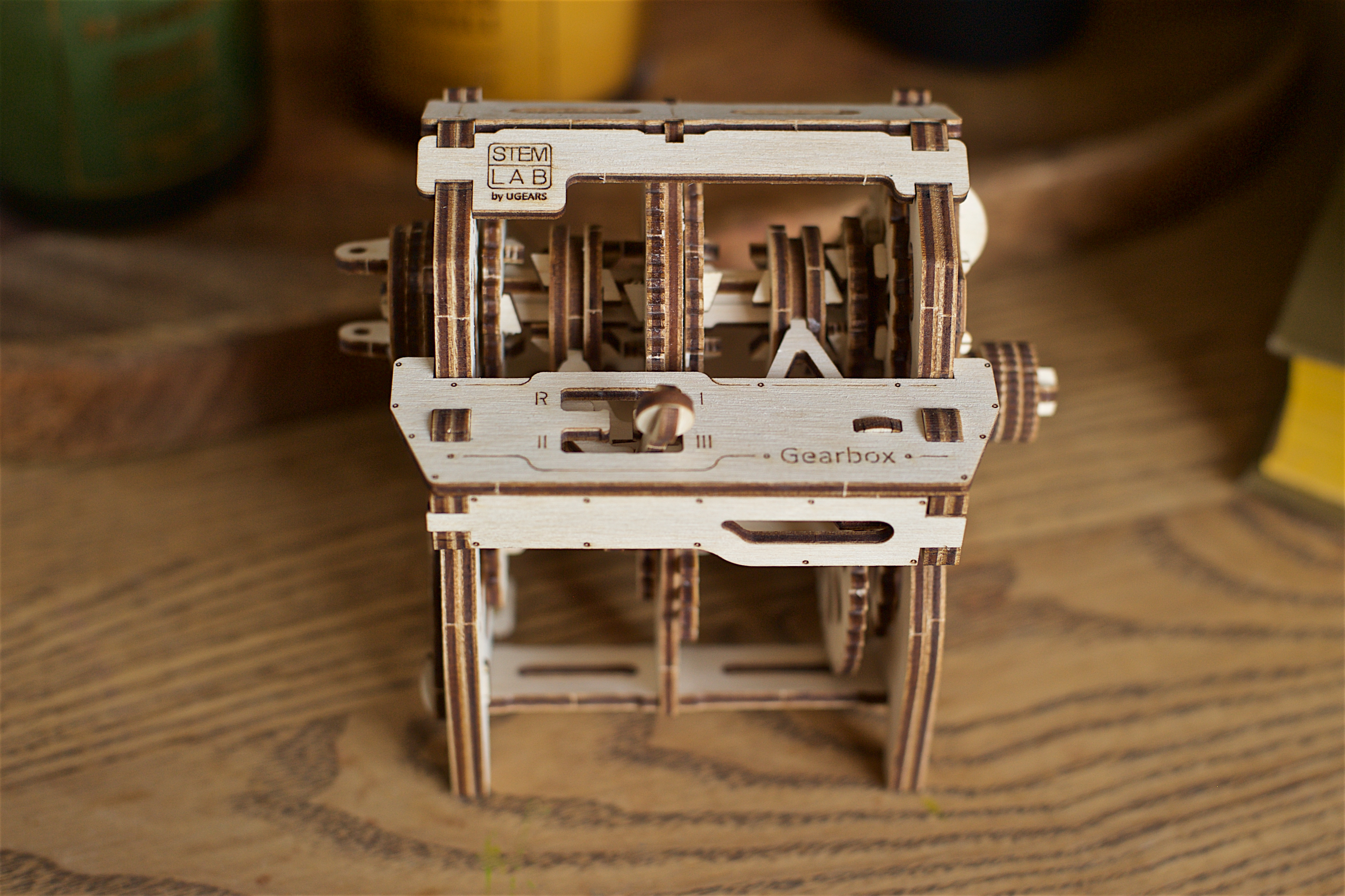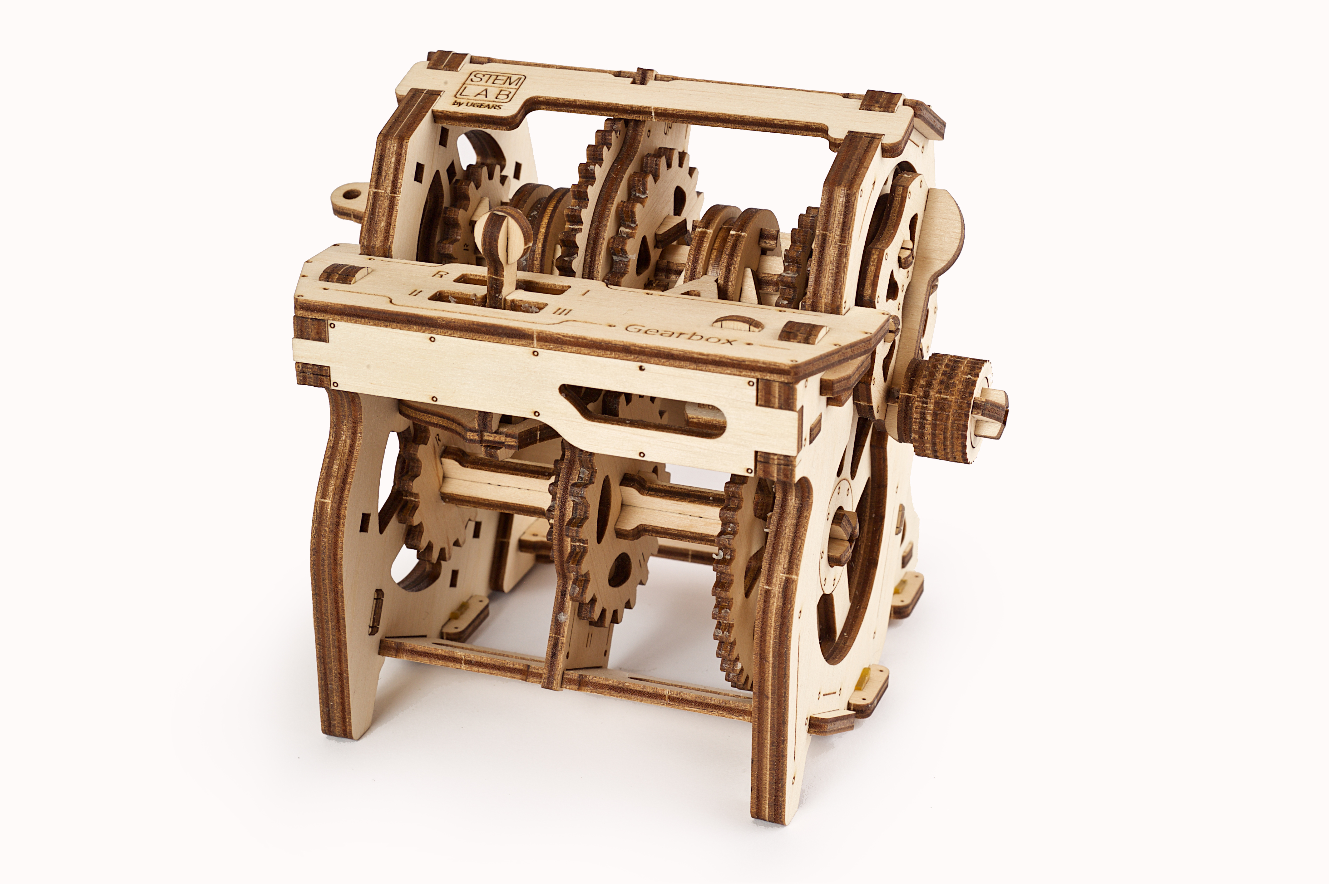 Skrzynia biegów to stylizowany, edukacyjny model. Interaktywny przewodnik po świecie mechaniki stworzony z myślą o poznaniu podstaw pracy danego modelu. Mechaniczna skrzynia biegów to reduktor zapewniający przyspieszenie i transmitujący moment obrotowy z silnika na koło napędowe. Po złożeniu możesz eksperymentować z modelem Ugears – wrzuć 1, 2, 3 lub bieg wsteczny korzystając z kinematycznej pary biegów dostosowując różny stosunek obciążenia, oraz obracając siłownik w prawo, może obserwować i kontrolować prędkość obrotu wału pośredniego i napędowego. W pozycji „N” – czyli na biegu jałowym sprzęgło wału korbowego pozostaje rozłączone. Pierwszy bieg sprawia, że wał pośredni i koła zębate obracają się z najmniejszą prędkością; Drugi bieg pozwala wałowi napędowemu i kołu zamachowemu obracać się ze średnią prędkością. A Trzeci Bieg pozwala wałowi pośredniemu i wszystkim kołom zębatym obracać się z największą prędkością. Możesz również wrzucić bieg wsteczny i zobaczyć jak sprzęgło przesuwa się w lewo w stronę koła zębatego oznaczonego literką „R”, następnie łączy się z nim i przenosi obrót z najmniejszego koła zębatego i zaczyna napędzać wał pośredni wraz z zębatkami wstecz.